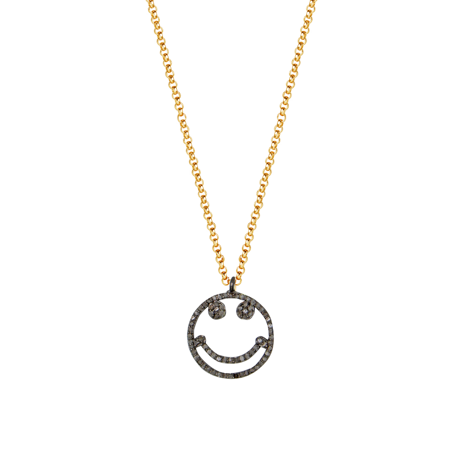 Add a touch of playful luxury to your collection with the Supreme Happy Face Charm Necklace. Expertly crafted from oxidized sterling silver, this signature charm features a smiley face design adorned with shimmering antique-cut diamonds for a vintage yet edgy appeal. The charm is elegantly suspended from a delicate 14K gold chain, offering the perfect balance of sophistication and streetwear-inspired style. Whether layered or worn solo, this unique piece brings joy and bold character to any look. 18mm